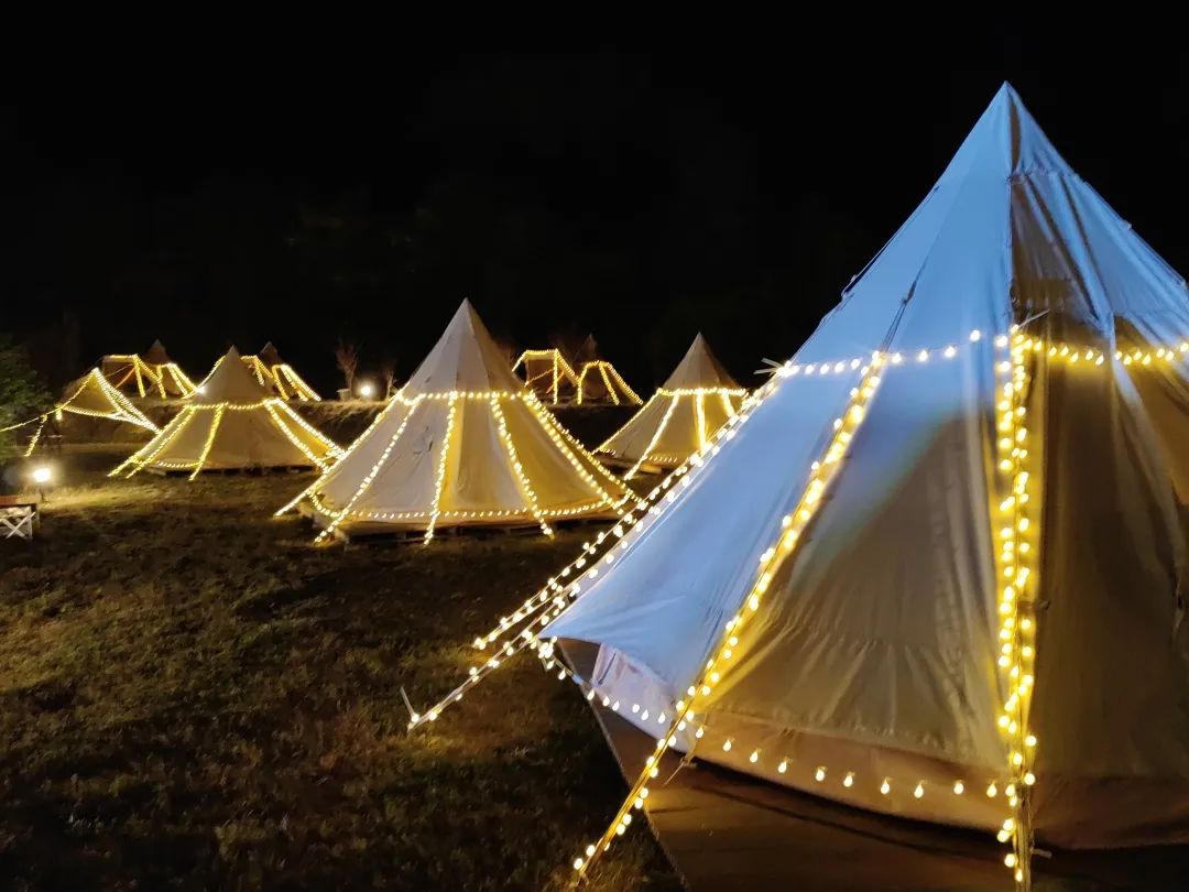 3. 露营帐篷区:错落的帐篷搭配暖黄小灯串,白天拍清新森系,晚上开灯后氛围感直接拉满,和闺蜜 / 情侣合拍超有感觉