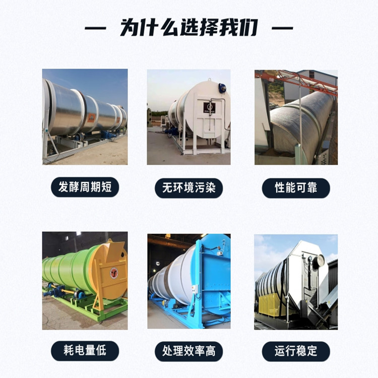 出料端连接喷淋塔净化装置,可除臭味,一般不需要外接热源,依靠物料自身发酵温度产生热量,滚筒外部设有保温层,以维持发酵温度。具有产量大(单台1-20吨日产量),用电少(驱动电机功率小),价格便宜,机械化程度高等特点。